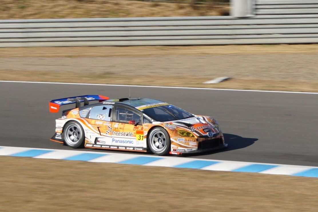 続いてGT300クラス。No.31 OGT Panasonic Prius プリウスです。最高速のあまり出ないここもてぎでも軽く200キロオーバー。エコのイメージとはかけ離れたモンスターマシンです。