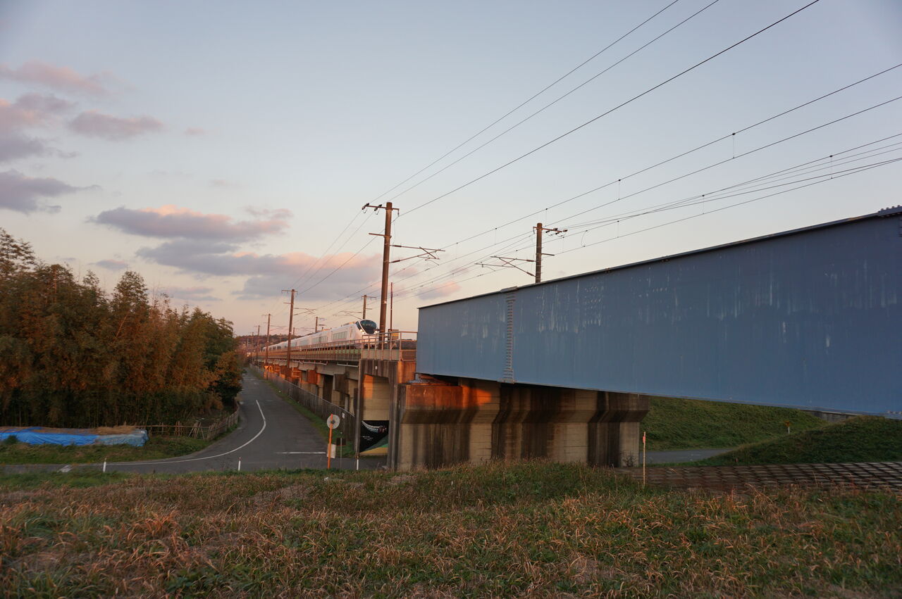 河川敷に到着して数分で特急がやって来たので、カメラのシャッター優先(1/125秒)、フォーカスモードを"コンティニュアス"にして、構えました。
