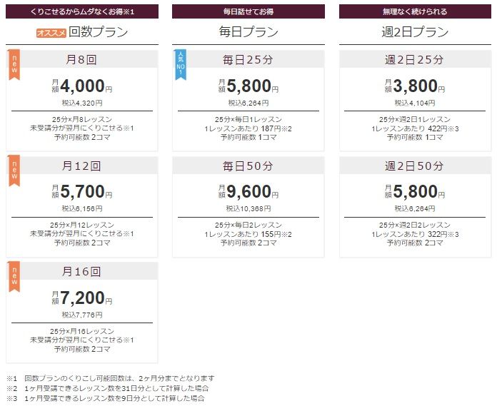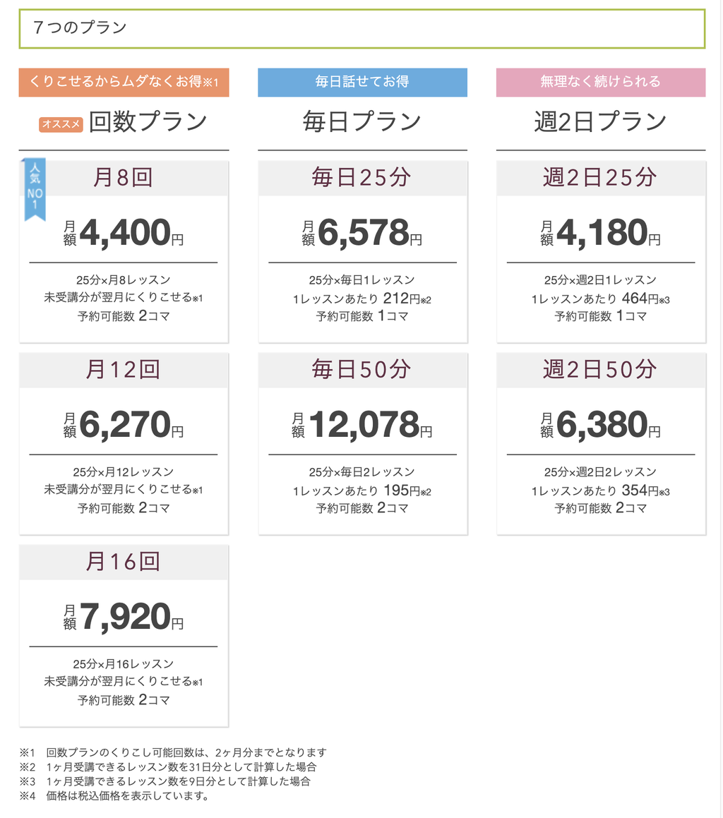 やはり実際に受講するとなると気になるのが料金体系。hanasoには2021年3月現在、7つの料金プランが用意されています。