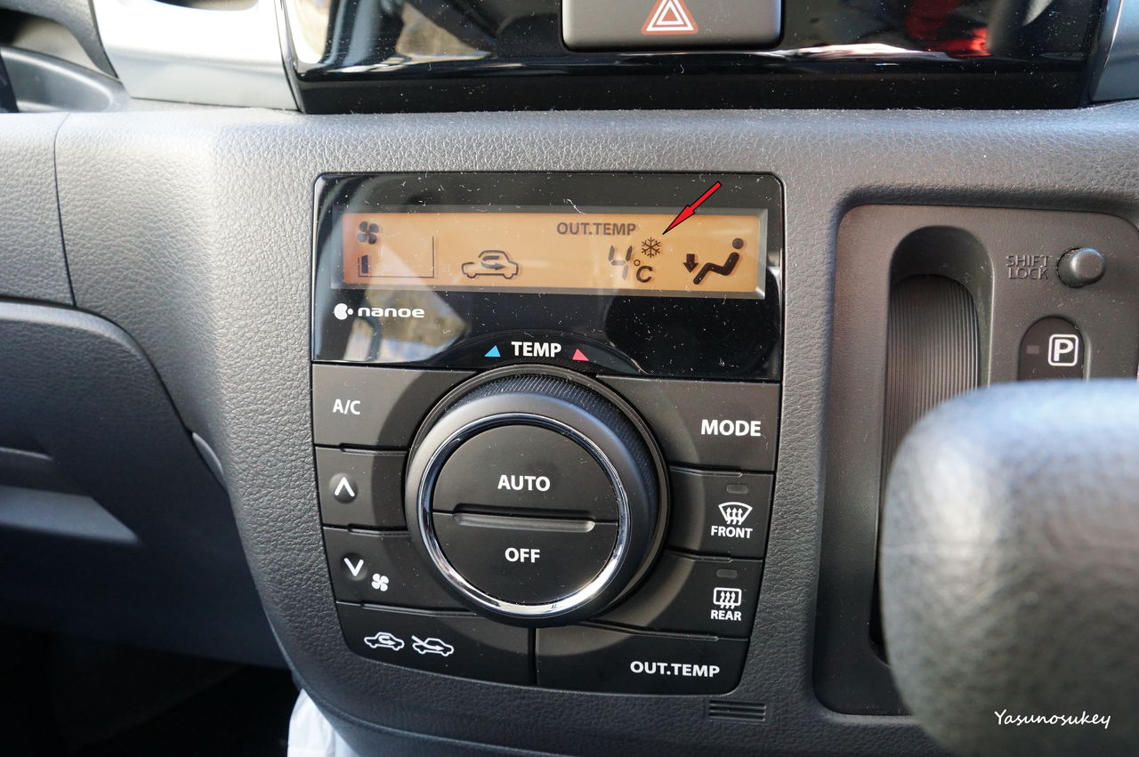 気温が4℃以下になると、エアコンのディスプレイ部に雪のマークがつきました。路面の凍結注意を促しているのかと思いますが、こういう細かい発見すると楽しくなります。I saw a snow flake popped up on the display on a day the temperature was 4℃ or lower. I think it is telling you to watch out for icy roads. I find it really cool.