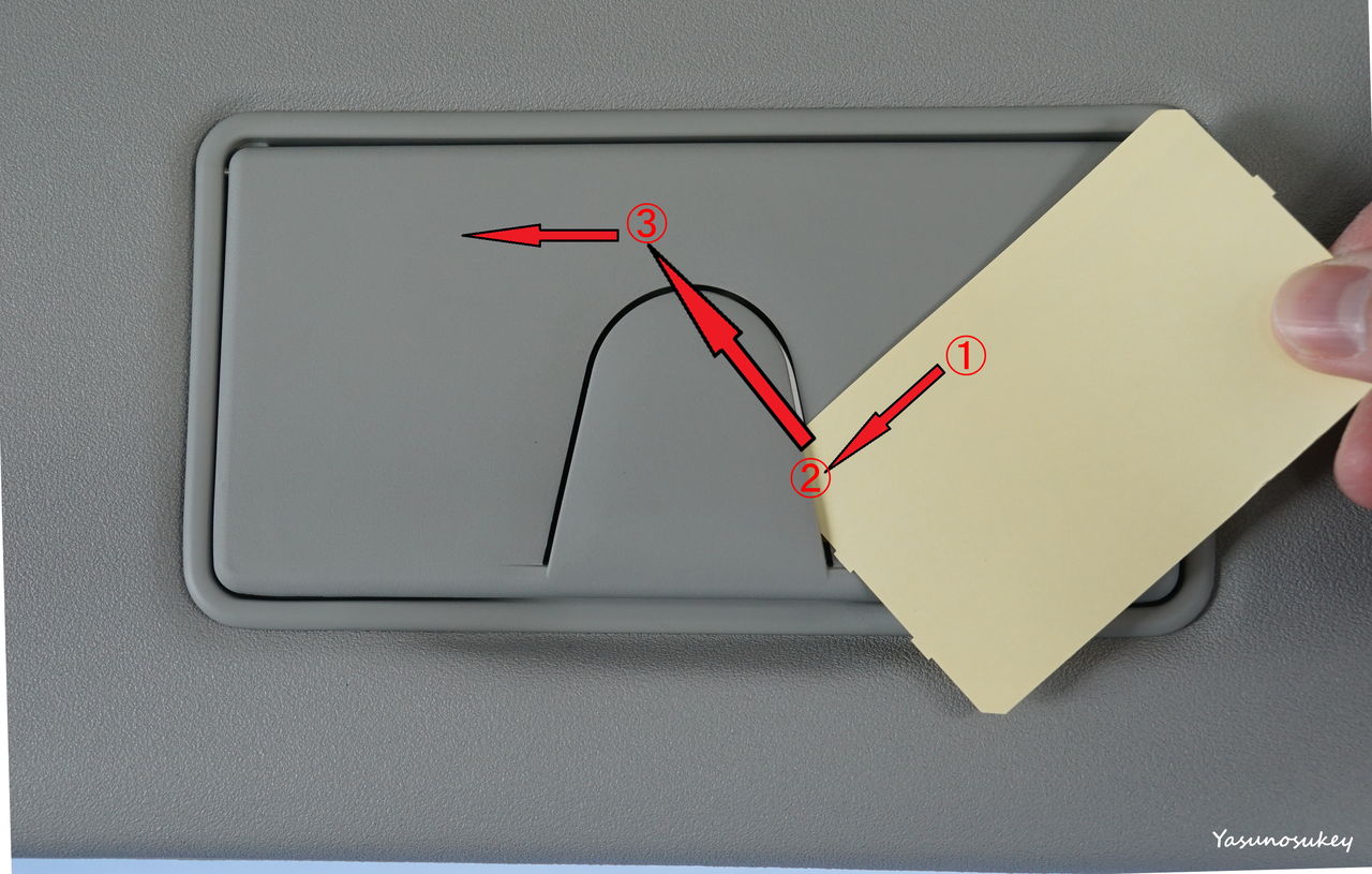 ▲1チケットホルダーの下の部分は比較的隙間が大きく、ここから駐車券の角を差し込むことができます。