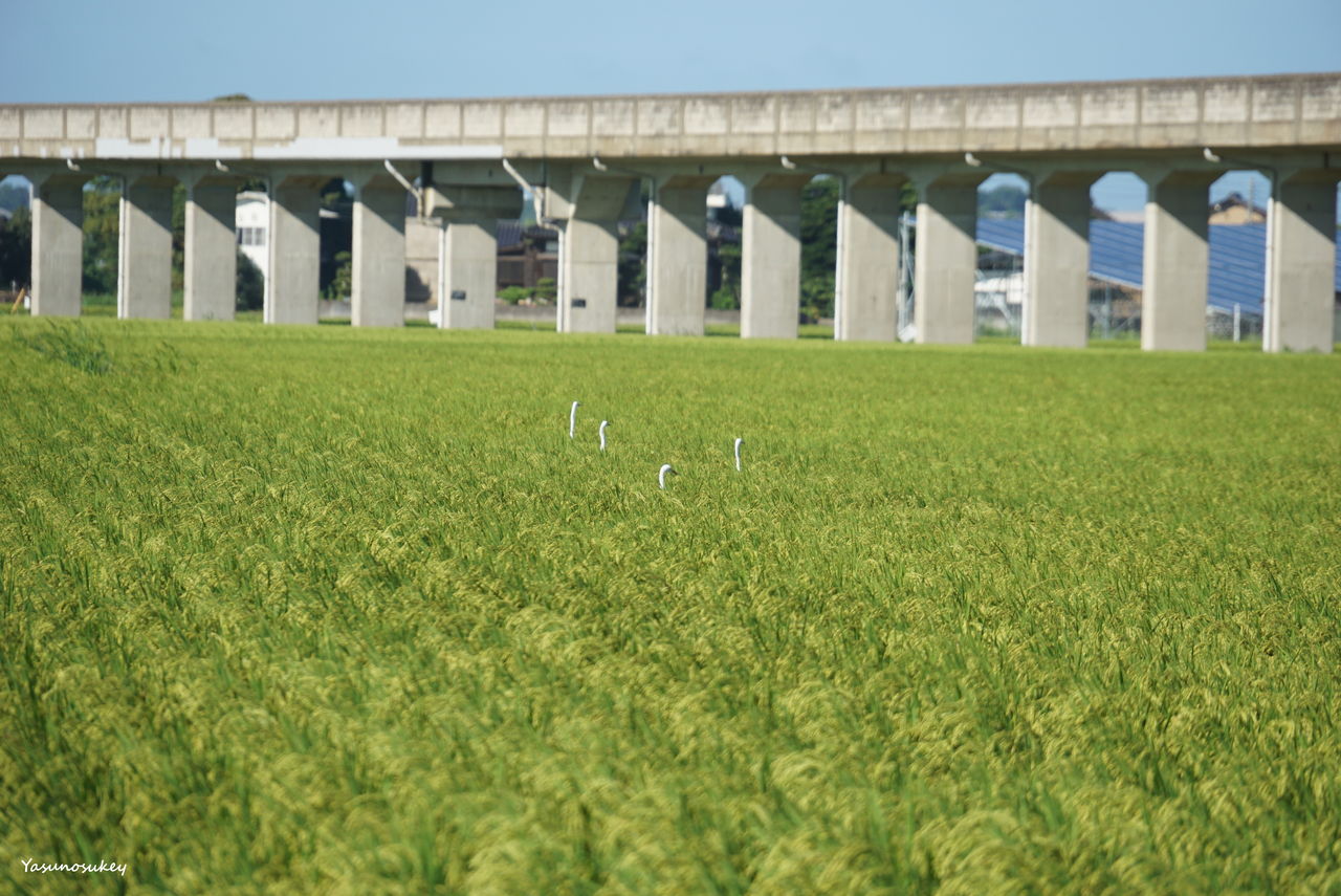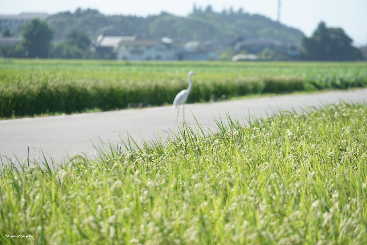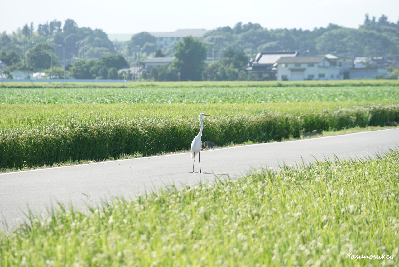 I took the following five pictures in Oharai in Ibaraki prefecture on Aug. 17. I was driving when I saw a white heron standing right in the middle of the road. So I hit the brakes hard and then rushed to take pictures of it.