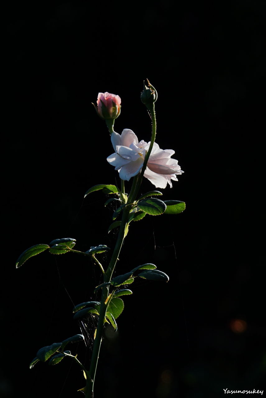 夕陽を浴びている庭のバラ。露出を敢えてマイナス補正して、背景を暗くしてみました。