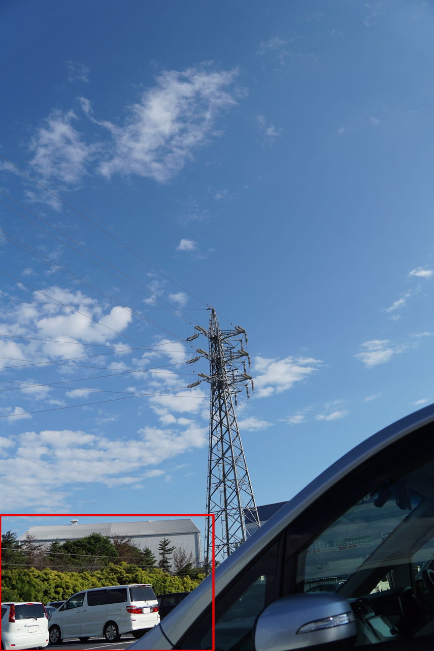 広角端18㎜、縦で撮影した写真。左下に写っているトヨタ・アルファードにご注目。