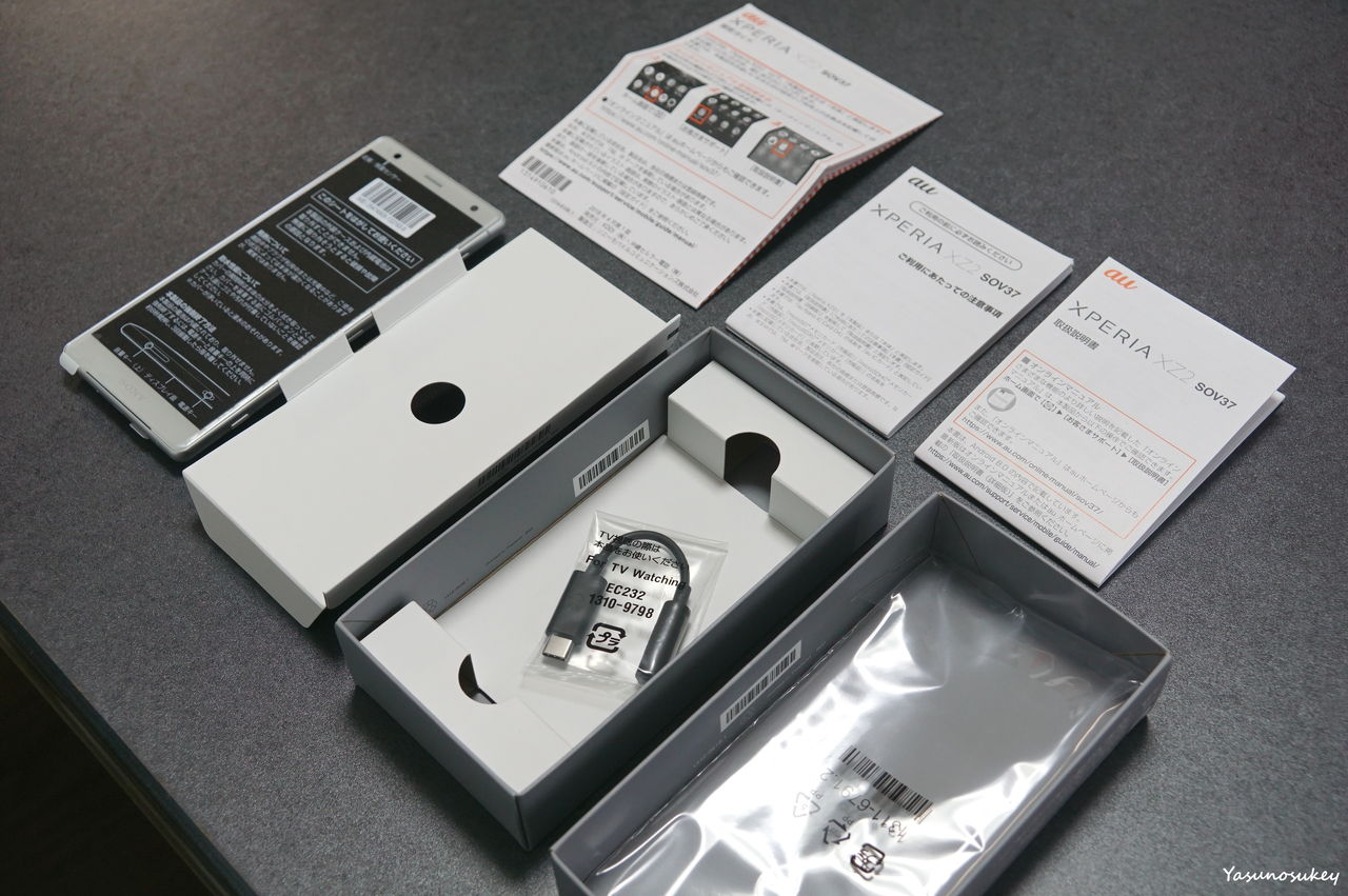 Xperia XZ2本体と箱、説明書一式とUSB-イヤホン変換アダプター。これで全てです。最近の機器は本当に付属品が少ないですね。充電に必要なUSB-Cケーブルすら入っていません。