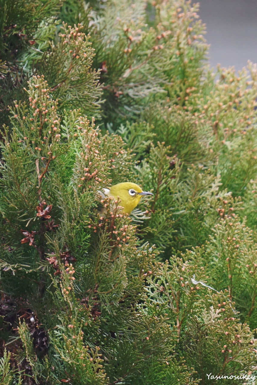 うちの庭のコニファーから顔を出すメジロ。かわいい。