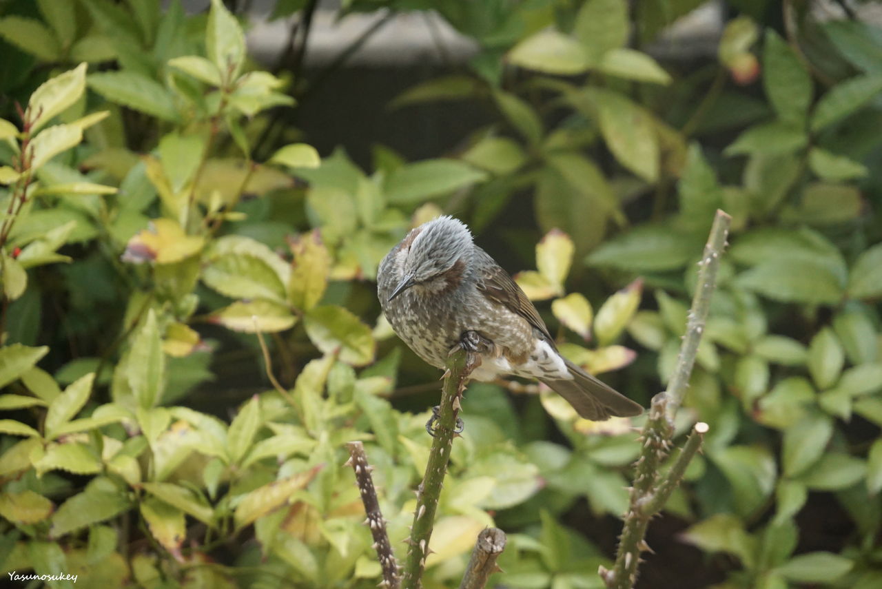 庭のバラの枝にとまるメジロ。