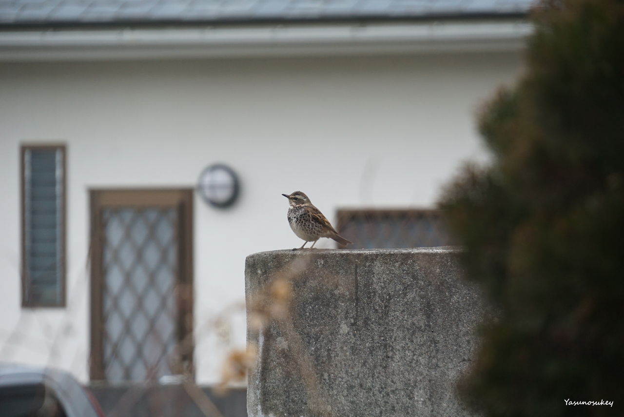 お隣さんの塀の上にとまったツグミ。