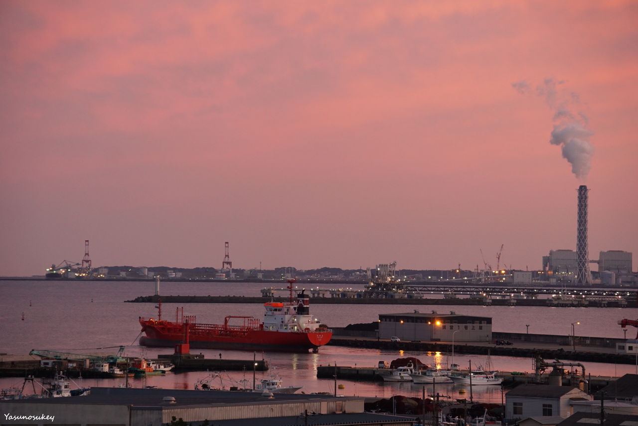 The purple-tinted fishing port. The color of the ship went perfectly with the sunset.