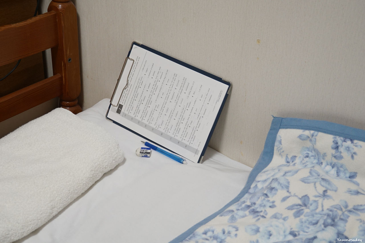 今回はご覧のようにクリップボードに過去問を固定し、横になって解きました。