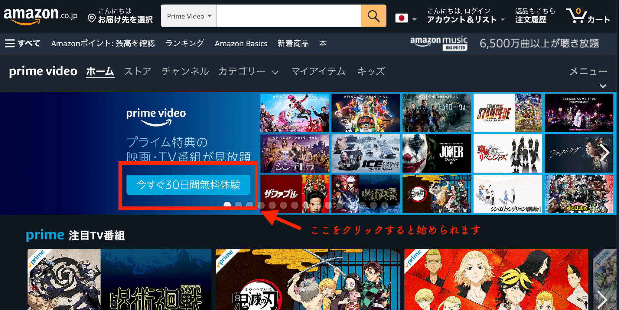 「すべてのビデオ」をクリックしたら、「いますぐ30日間無料体験」というボタンから登録すれば完了です。