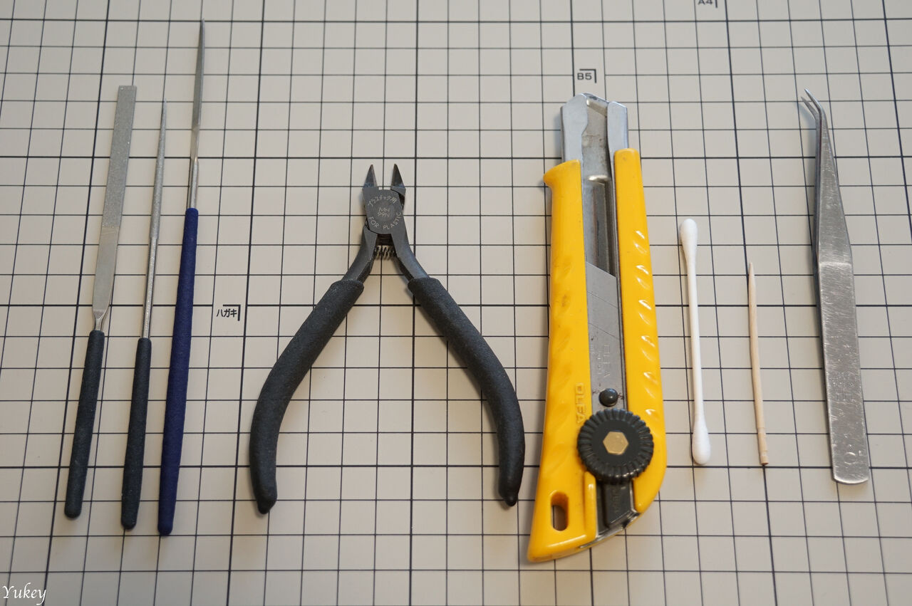 使用した工具はタミヤの精密ニッパー、つまようじ、ダイヤモンドヤスリ(3本)、ピンセットと綿棒。
