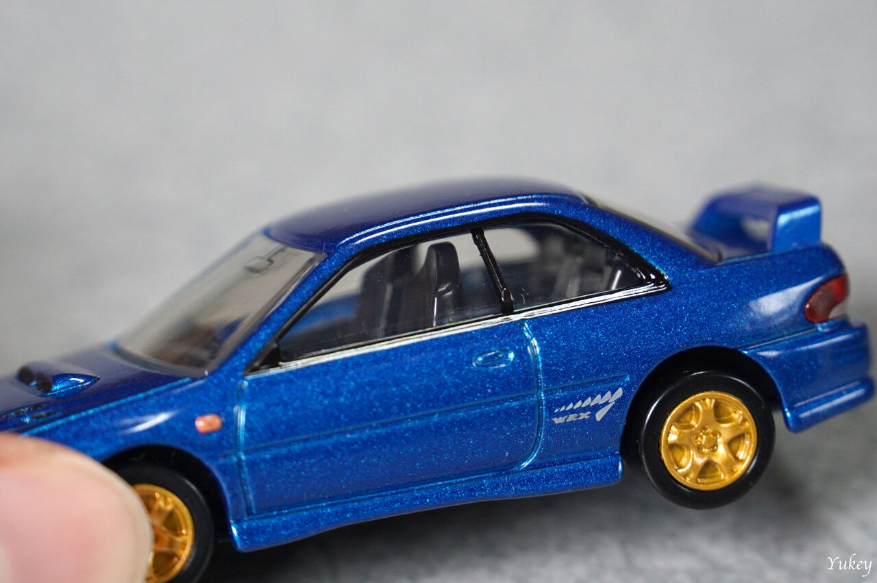 給油口の蓋も再現。スバルブルーの車体にゴールドのホイールがWRカーを彷彿とさせます。