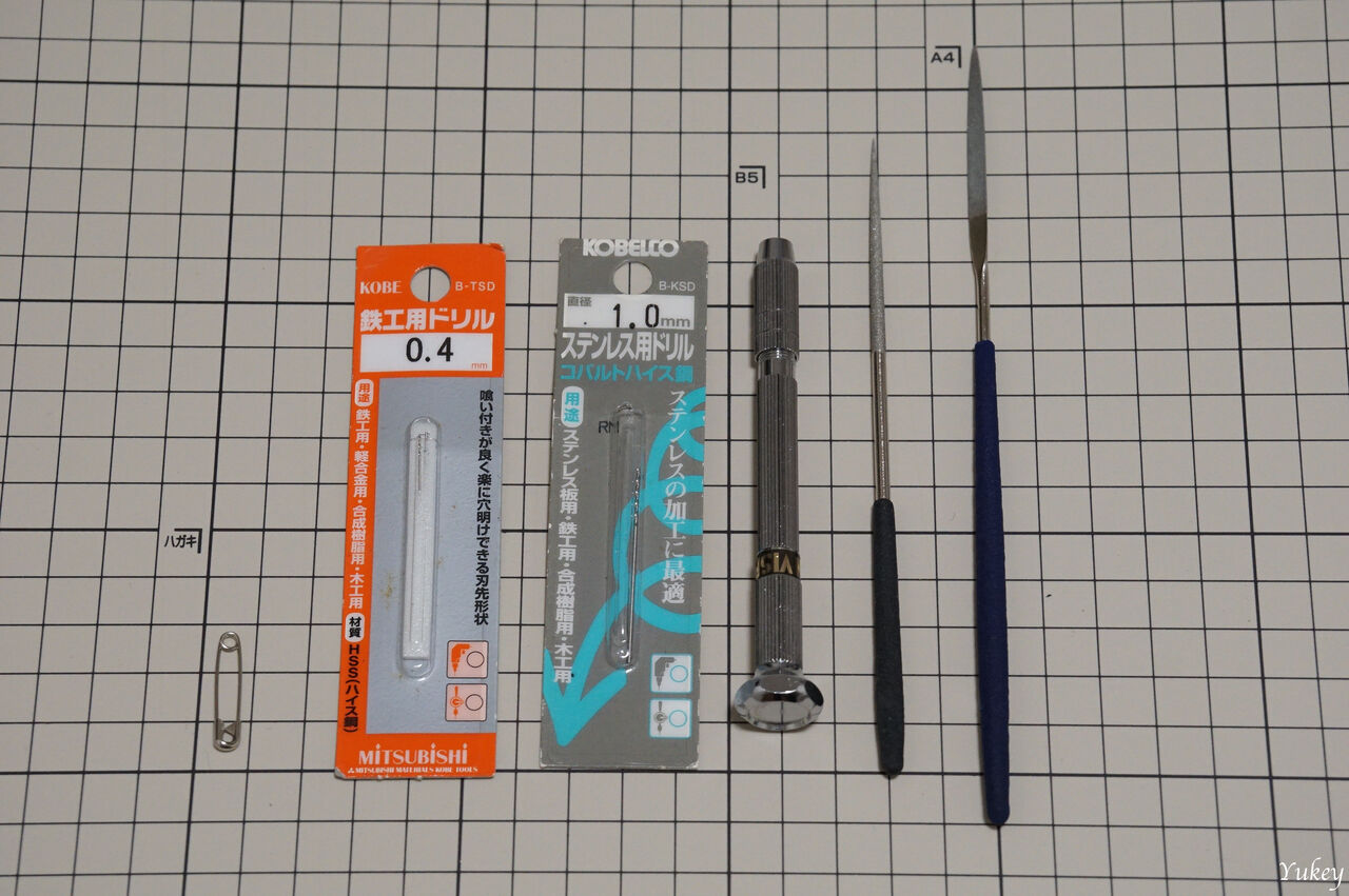 穴あけに使うツールは、左から安全ピン、0.4mm径と1mm径のドリルの刃、その刃を取り付けて使うピンバイス、穴を広げるダイヤモンドやすり丸型と半円形の2本です。