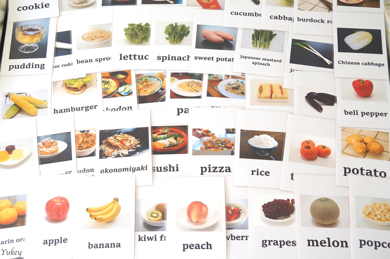 それから、私は今までにレッスンで使うため、さまざまな食べ物の写真と名前の載ったカードを自作しています。